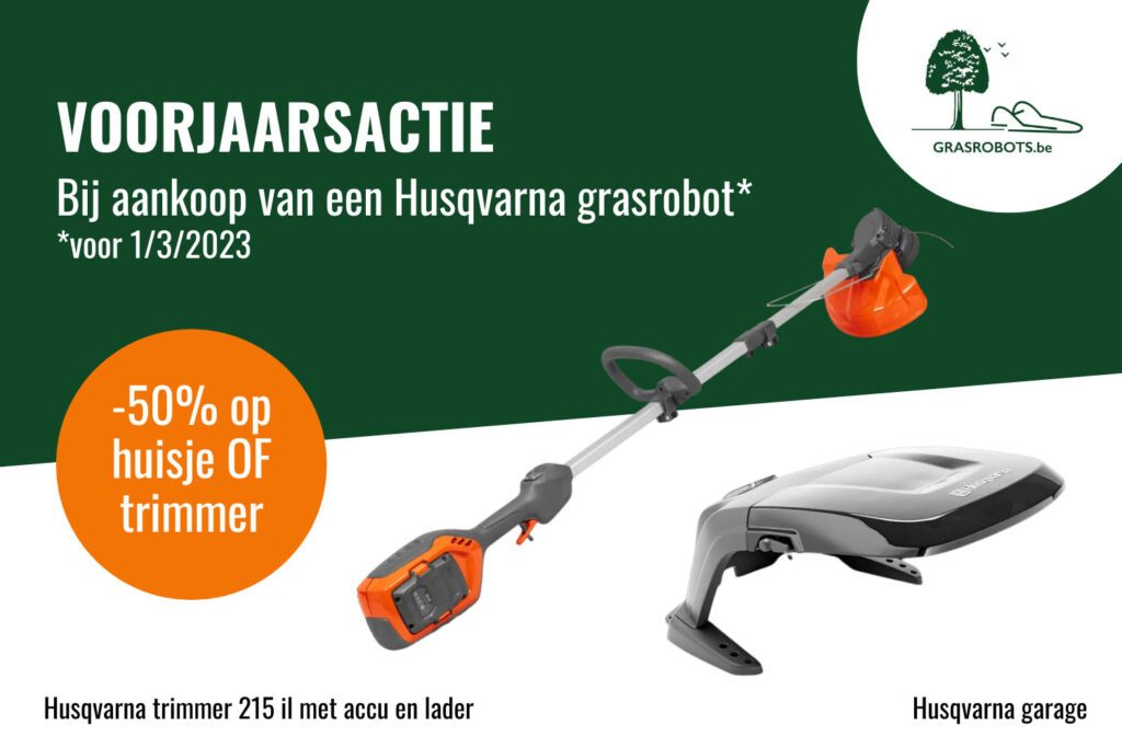 Bij aankoop van een Husqvarna grasrobot krijg je 50% korting op de Husqvarna trimmer 215iL (met accu en lader) of op een Husqvarna huisje voor je robotmaaier*. Aan jou de keuze!