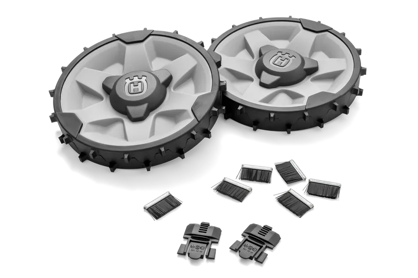 Set met zware achterwielen en wielborstels voor uitstekende tractie op glooiende gazons.